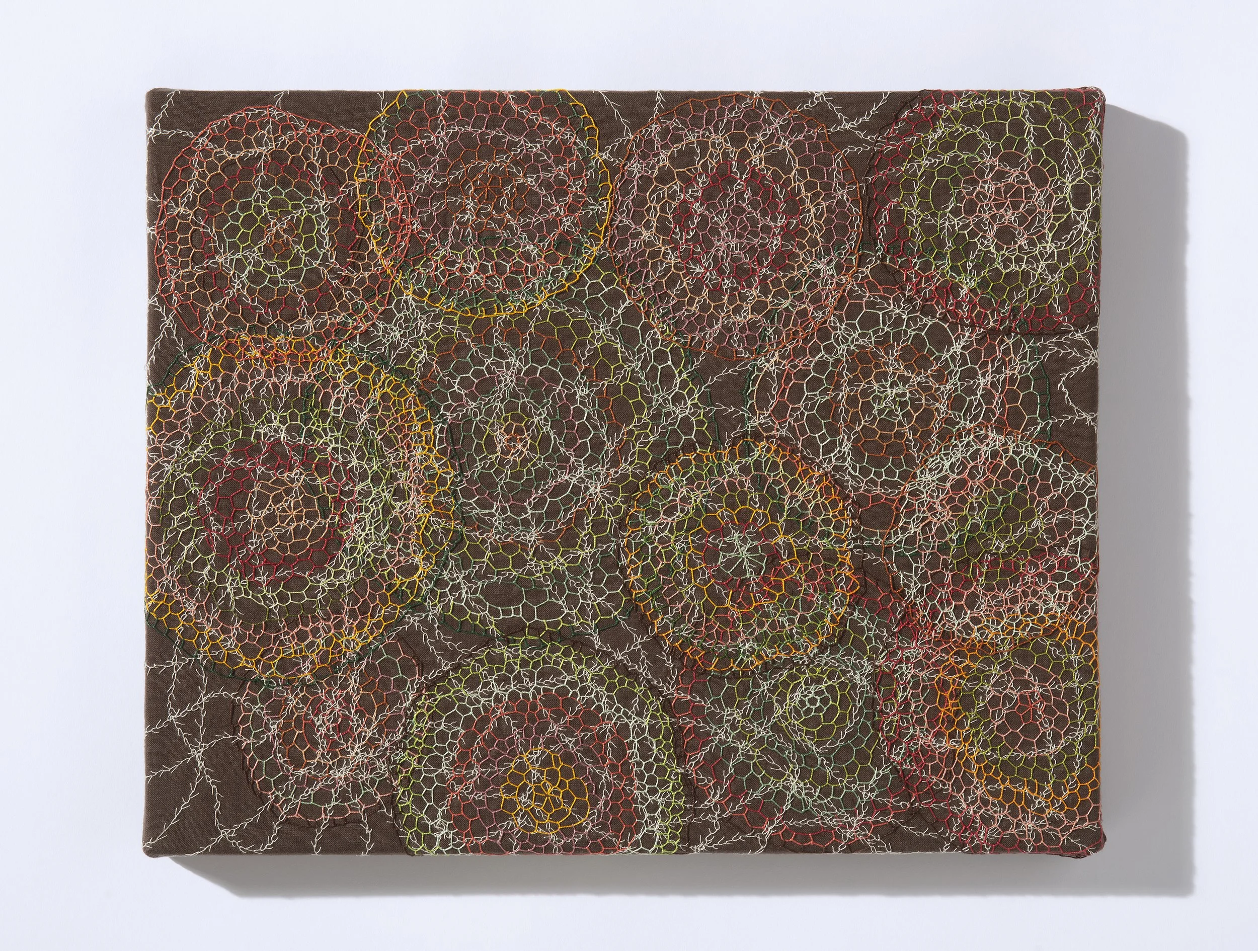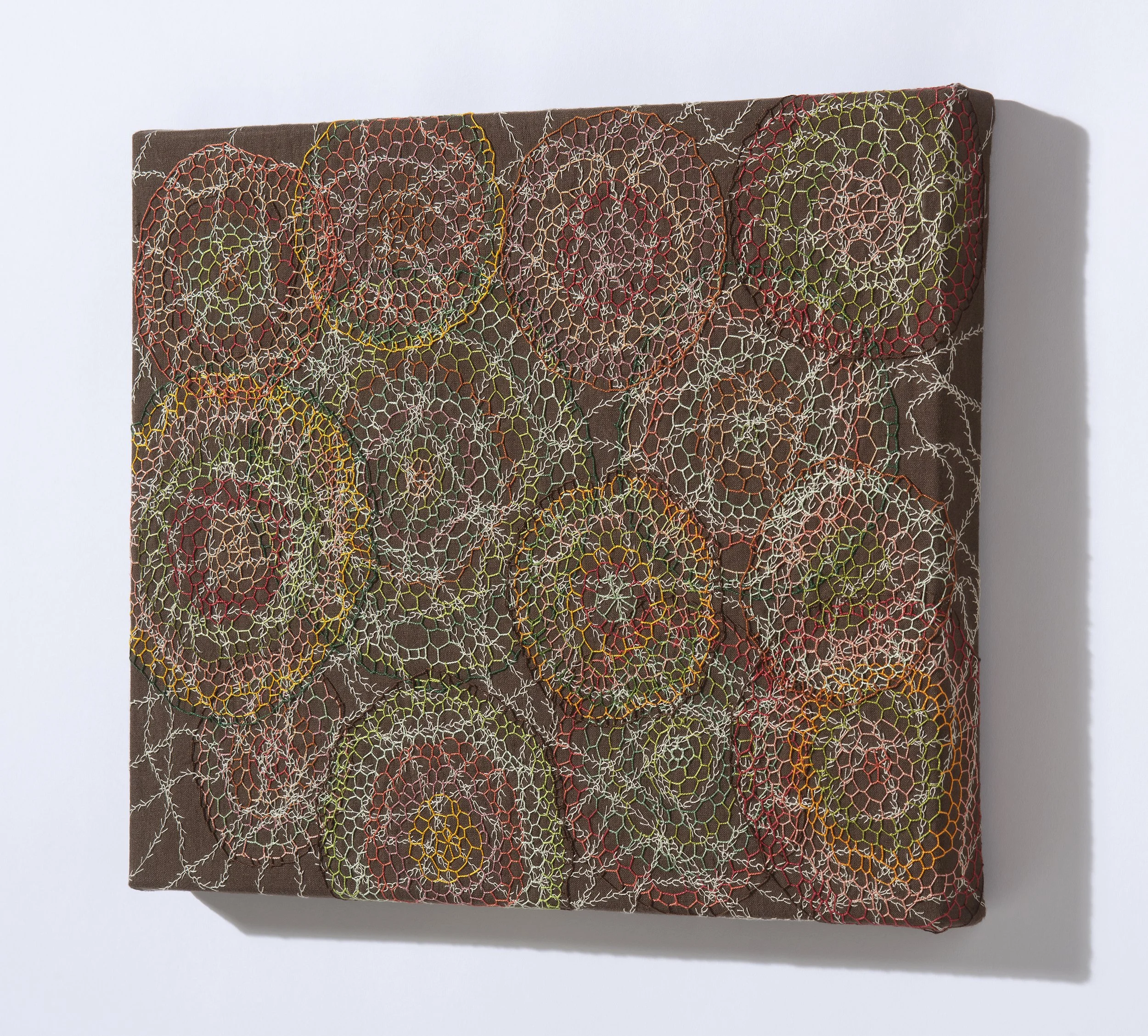 I am fascinated with the mycorhizzal network–mycelia connecting trees through their roots under the forest floor. The concentric circles represent the cross sections of trees; the winding feather stitches, mycelia
